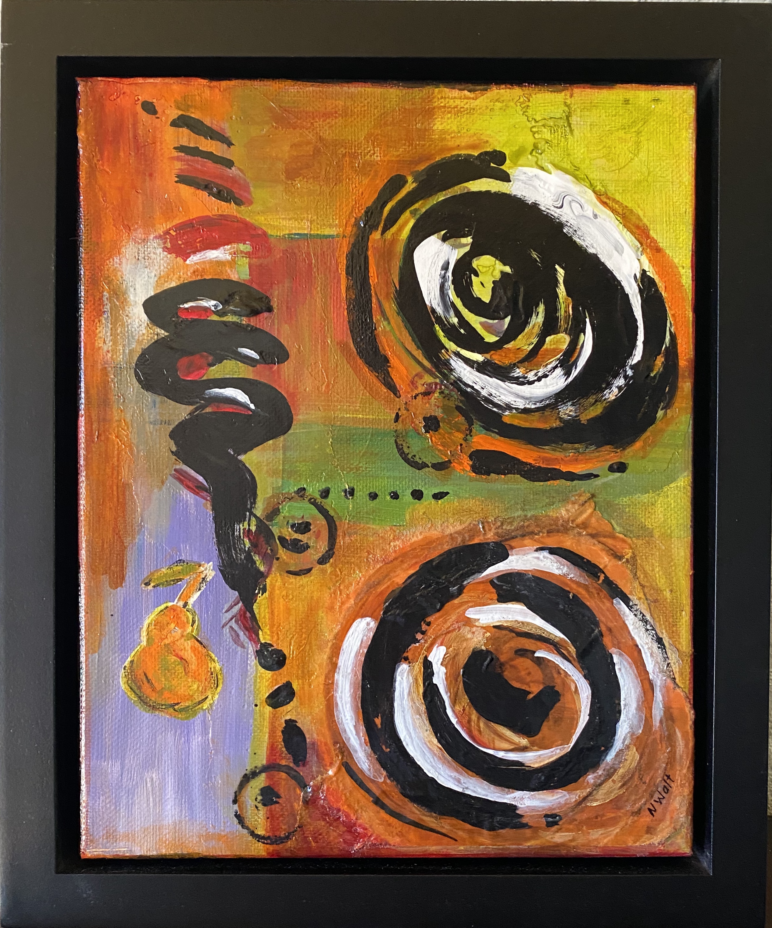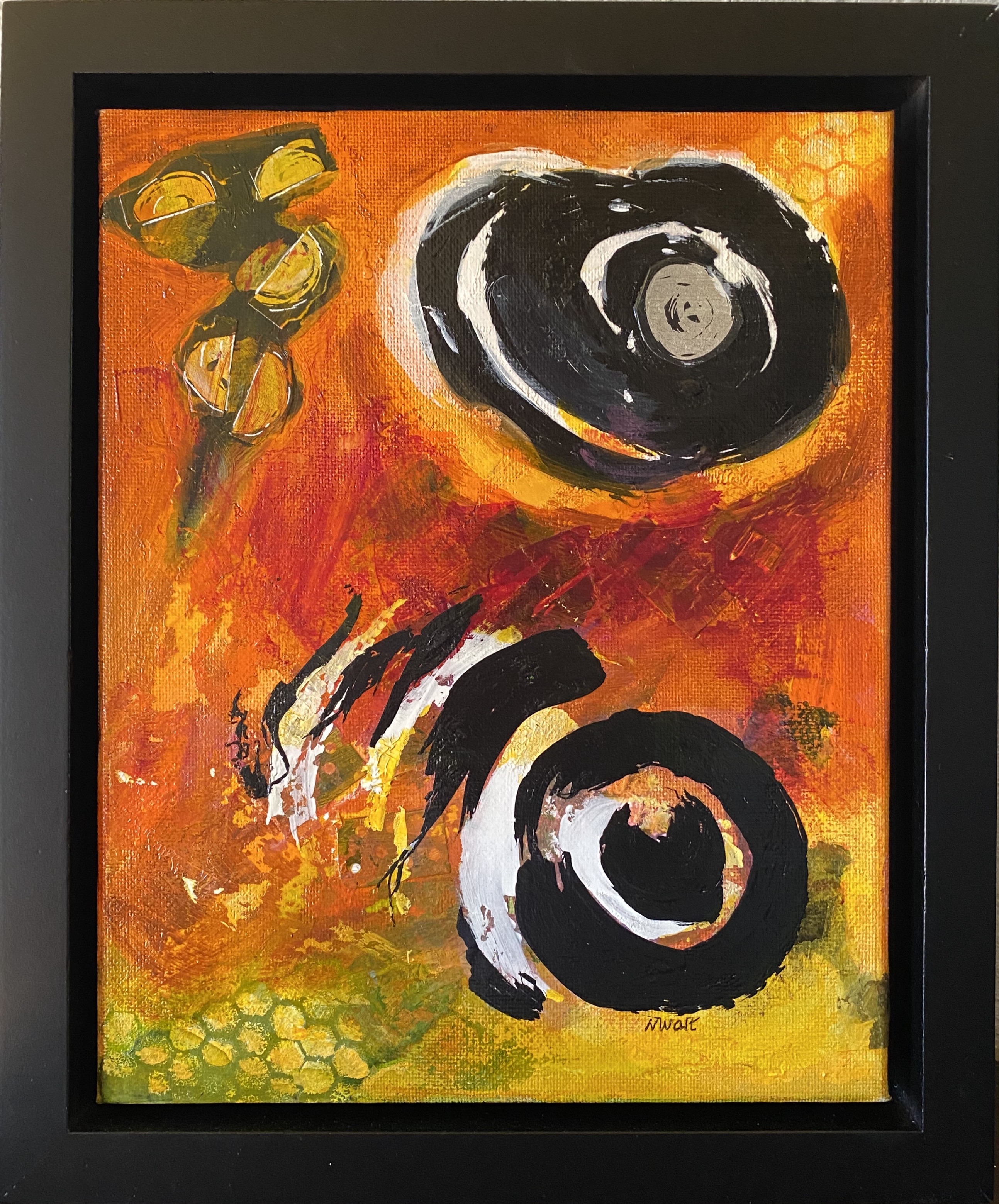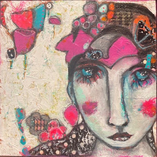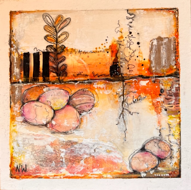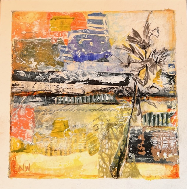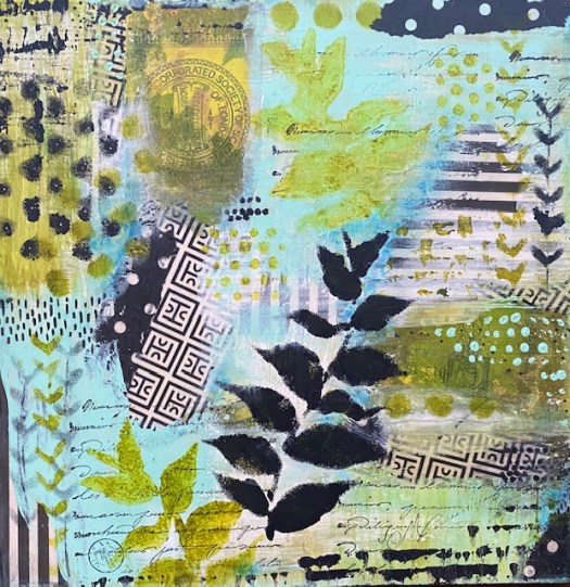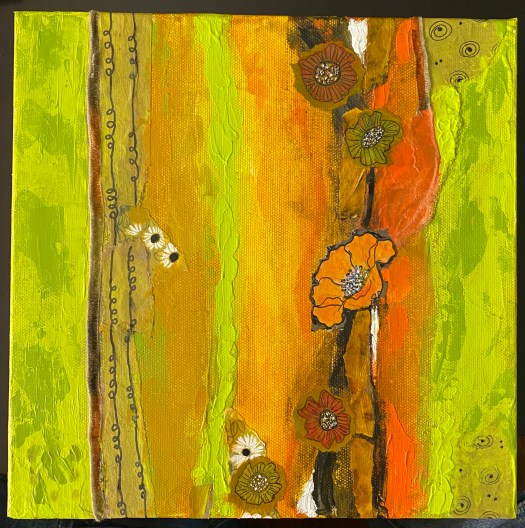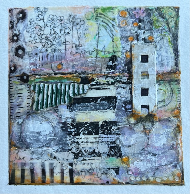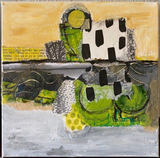 Acrylic and collage on deep canvas. 10 x 10. $120.