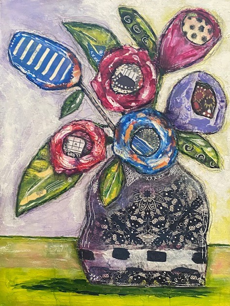Acrylic and collage on deep canvas; 12 x 16. $125