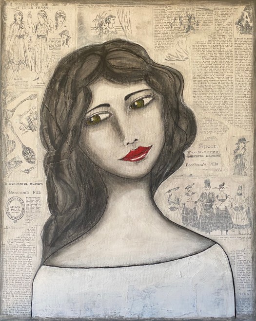 Mixed media: collage and acrylic on deep canvas, 16 x 20. SOLD