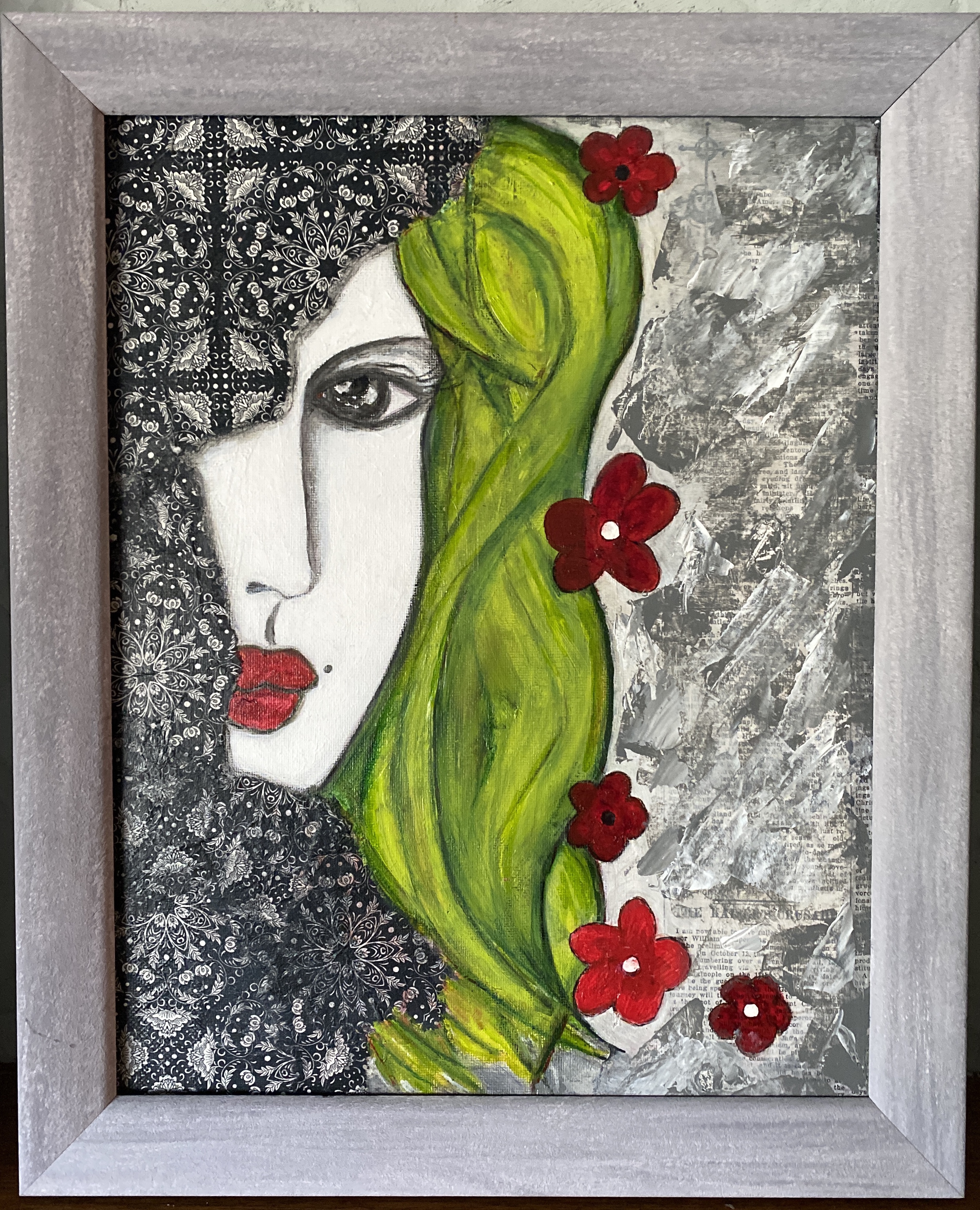 Mixed Media: acrylic & collage on canvas. 16 x 20. $350