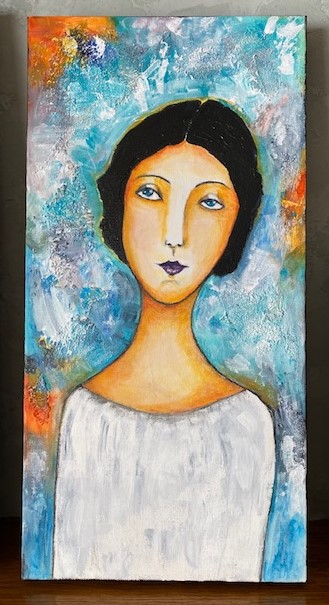 Mixed media portraiture: acrylic, resin, and neocolour II on deep canvas, 10 x 20. SOLD